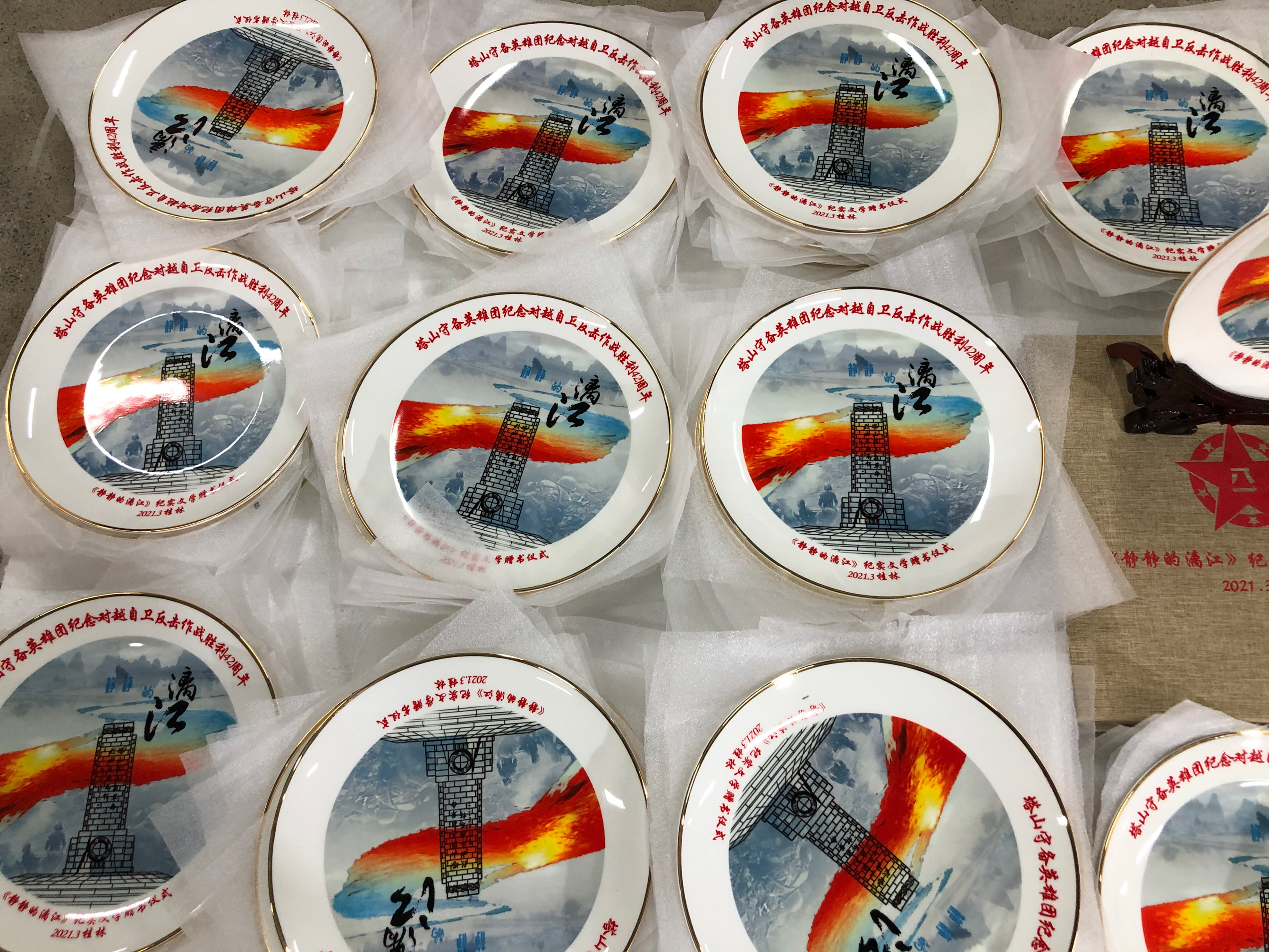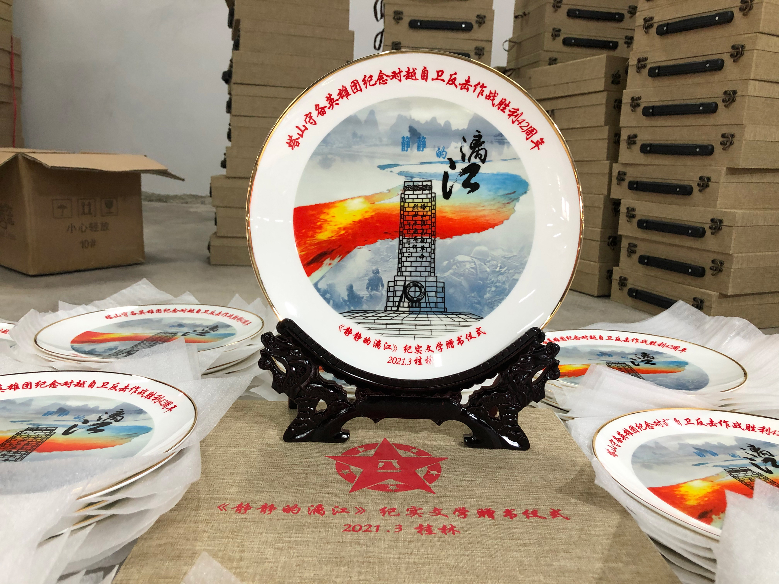 這次來定制的客戶是廣西桂林的,桂林有一個江,漓江,在對越自衛(wèi)戰(zhàn)時期,塔山曾經(jīng)駐扎過守備,本次的紀念盤定制就是為了紀念那些駐扎在那邊過的英雄團們,這次定制的盤子的的尺寸是十寸盤,含木架包裝錦盒,紀念盤的圖案是這樣的來看看: